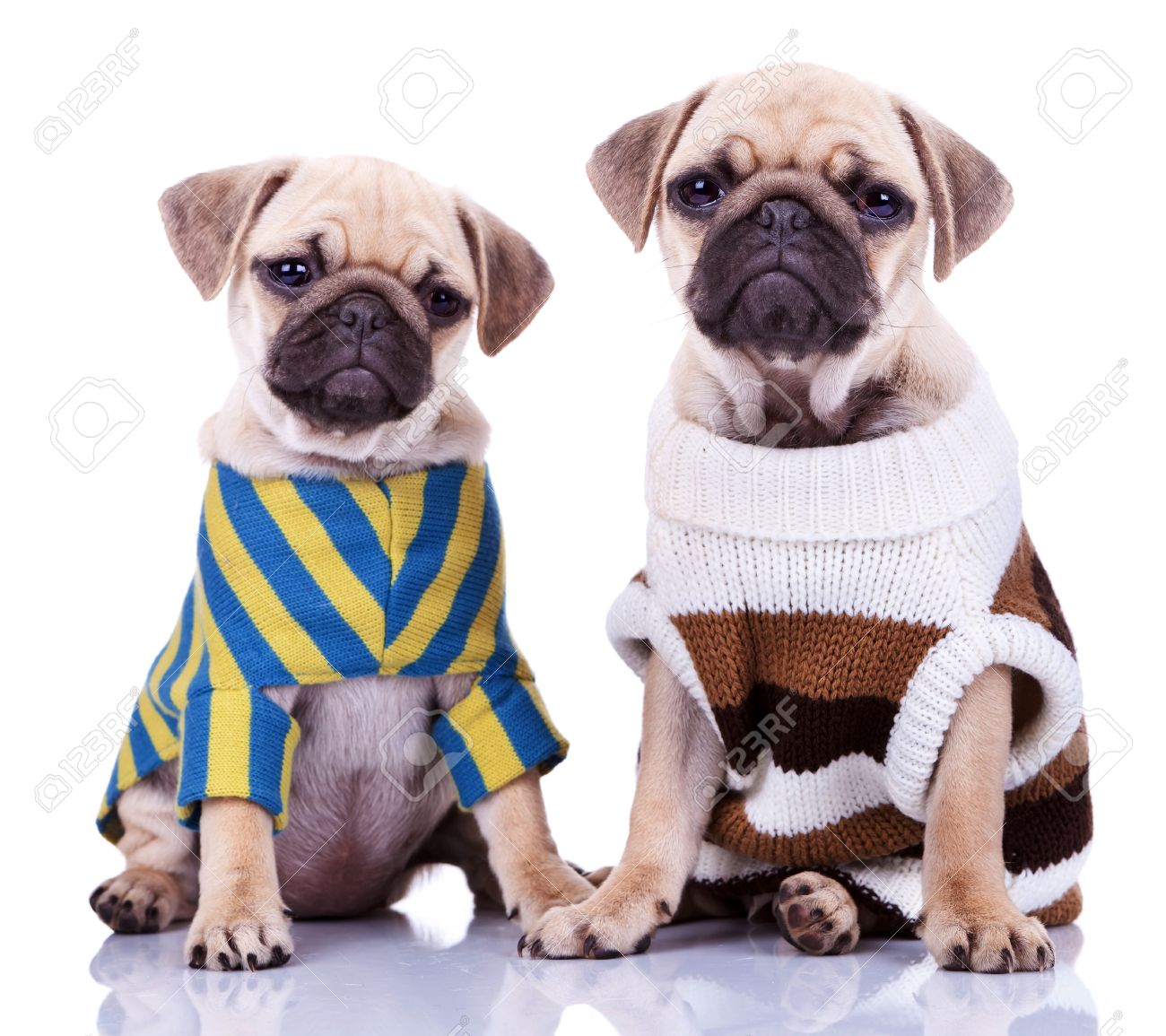 Zwei Niedlichen Mops Welpen Hunde Gekleidet Sitzen Auf Weissen