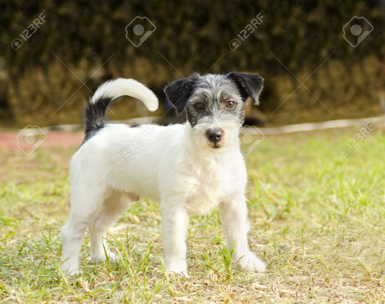 Eine Kleine Weisse Schwarze Und Graue Rauhhaarig Jack Russell