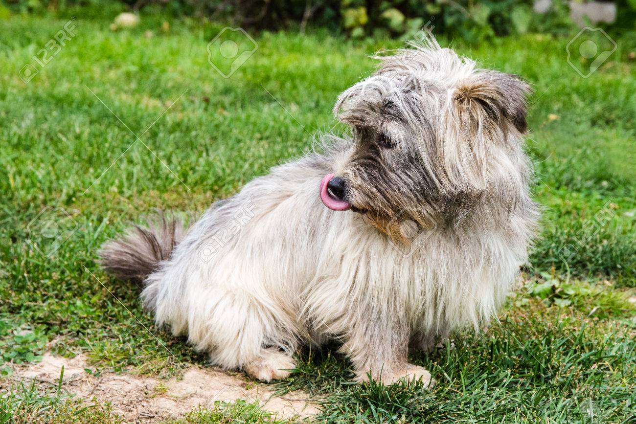 Kleine Flauschige Graue Hund Sitzt Im Gras In Der Nahe Von Weissen