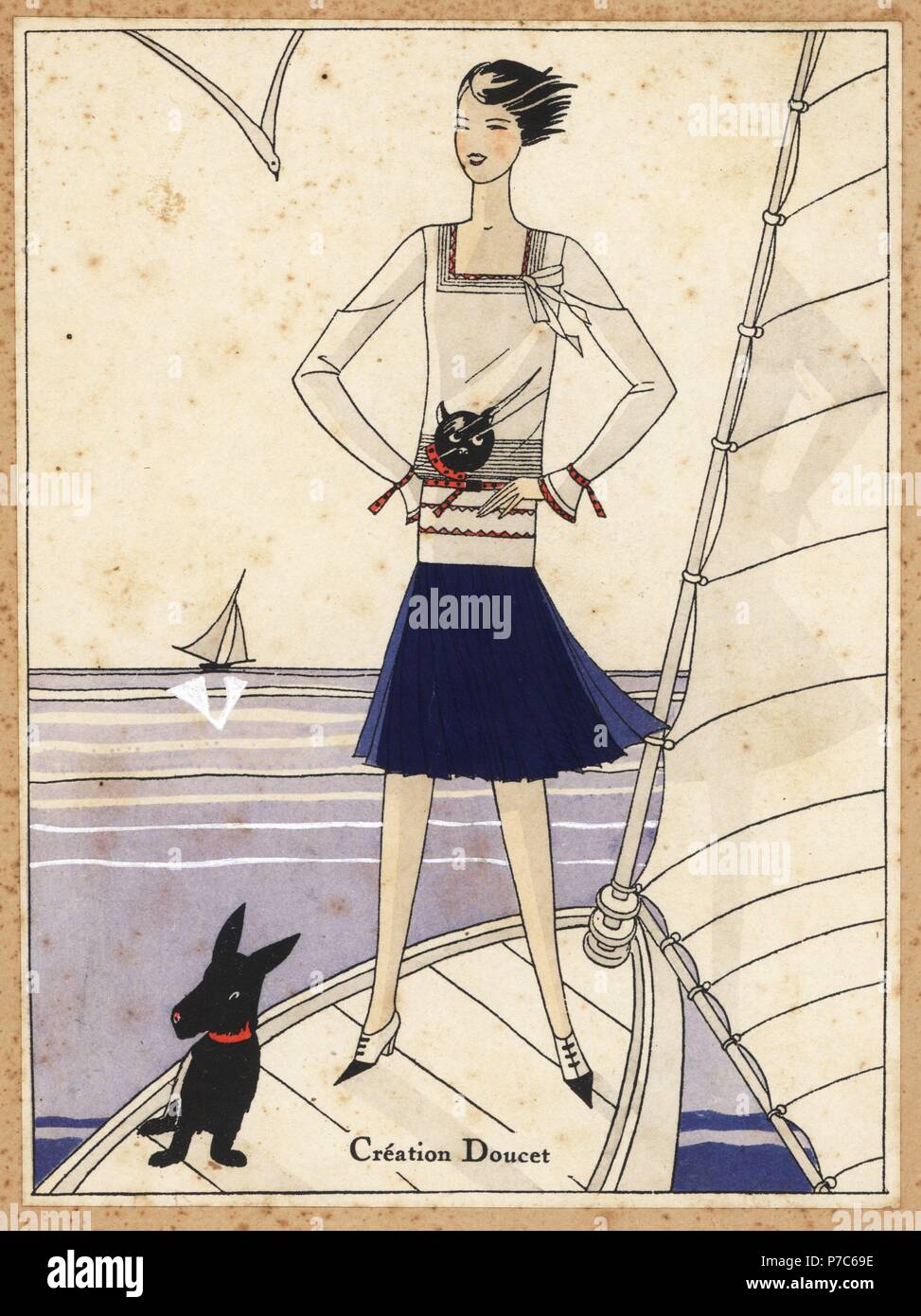 Frau In Sailor Outfit Auf Einer Yacht Mit Hund Papierkorbe