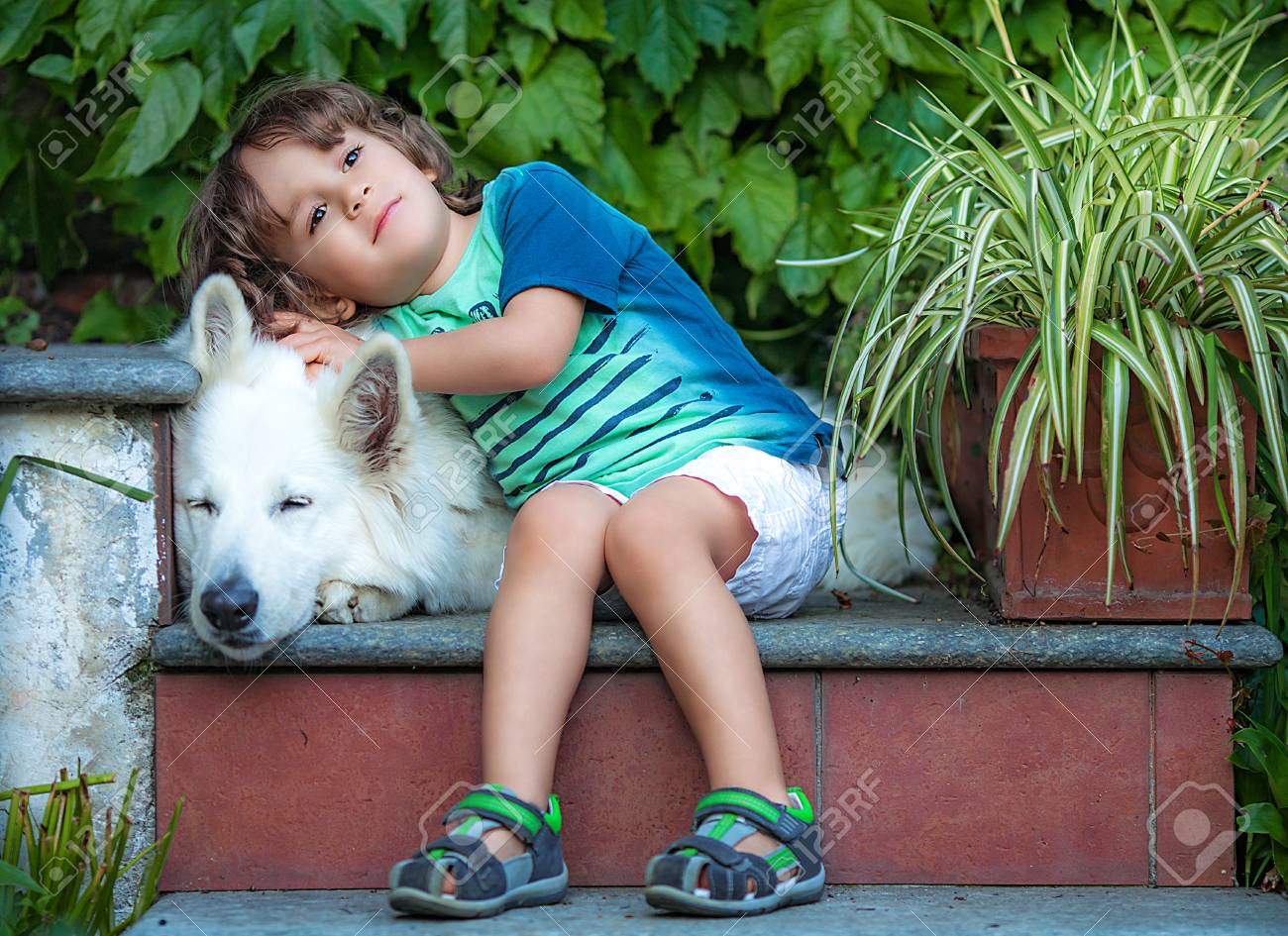 Zartliches Baby Mit Hund Schweizer Weisser Schafer Lizenzfreie