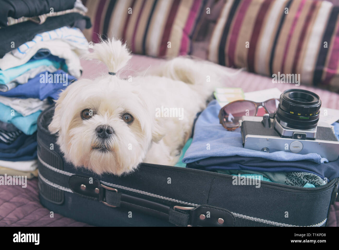 Kleine Hund Malteser In Den Koffer Oder Tasche Sitzt Und Wartet