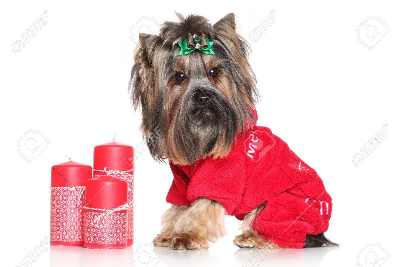Yorkshire Terrier Mit Roten Weihnachtskerzen In Mode Hund Kleidung